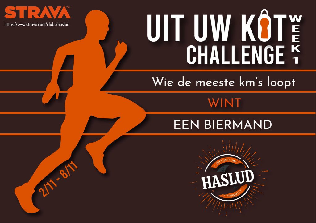 KOM UIT UW KOT!Geen categorie / 3 november 2021 13 december 2021 / 3 reacties Ook wij zitten niet stil! Daarom organiseren wij “UIT UW KOT CHALLENGE”. De bedoeling is dat jullie zoveel mogelijk km’s lopen in de week van 2- tot 8 november. Jullie resultaten registreren doe je via onze club op Strava! https://www.strava.com/clubs/haslud De winnaar zal een heerlijke biermand winnen! Meedoen is de boodschap! Volgende week staat er iets anders op de planning! Fietsen Lopen ?? Sportief tijdens lockdown? Dan is den Haslud zeker op de goeie weg!
